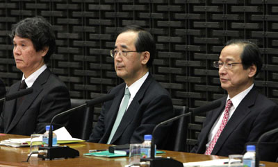 日本央行行長白川方明(中)15日在分行行長季度會議上說,央行將通過維持利率零水平以及穩步擴大資產購買計劃,來持續放松銀根。他表示,盡快克服通縮對于日本經濟至關重要。
