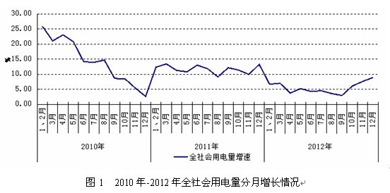 2012年,全社會用電量達4.96萬億千萬時,同比增長5.5%,增速較上年回落6.51個百分點。全社會用電月度增速自3月開始波動下降,隨著國家宏觀調控作用顯現及受去年基數較低作用影響,10月開始用電增速逐月回升(圖1)。分季度看,一、二、三季度全社會用電量分別為11657、12095和13101億千瓦時,同比分別增長6.8%、4.3%和3.9%,增速逐季回落,四季度全社會用電增速達7.45%,回升顯著。