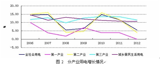分產業看,2012年第一產業用電量1013億千瓦時,與上年持平;第二產業用電量36669億千瓦時,同比增長3.9%,增速較上年同期降低8.29個百分點,占全社會用電量的比重也較上年同期下降1.10個百分點。第三產業和城鄉居民生活用電量分別為5690億千瓦時、6219億千瓦時,同比分別增長11.5%和10.7%,均保持較快的增速,拉動全社會用電增長2.52個百分點(圖2)。