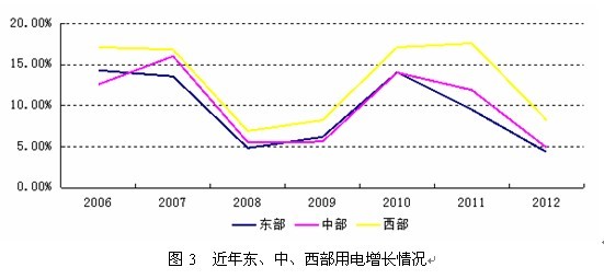 近年來西部地區用電增速持續高于東、中部地區(圖3)。2012年,東、中、西部地區用電增速分別為4.36%、4.92%和8.27%,西部地區增速分別高于東、中部地區3.91和3.36個百分點,東、中、西部地區用電增速較上年同期分別下降5.16、7.00和9.34個百分點。