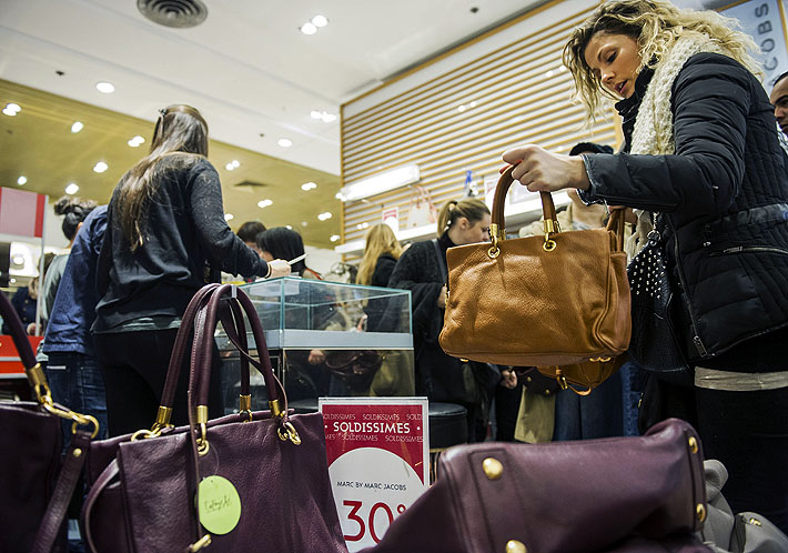 人們在法國巴黎老佛爺百貨搶購打折商品。新華社發(埃蒂安·洛朗 攝) |