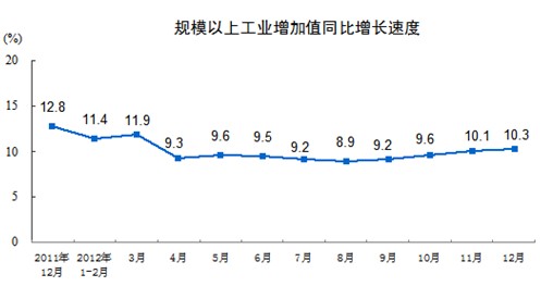 2012年12月份,規模以上工業增加值同比實際增長10.3