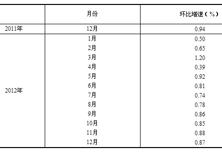 根據季節調整模型自動修正結果,對2011年12月份至2012年11月份的規模以上工業增加值環比增速進行修訂。修訂結果及2012年12月份環比數據如下: