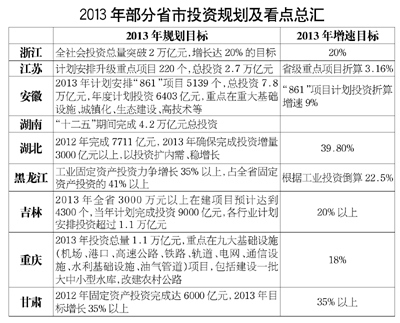 《經濟參考報》記者多方了解發現,在地方政府的增長計劃中,投資仍是重中之重,即使一些下調了增長目標的市也不例外。如武漢提出,堅持把加快工業發展放在經濟工作首位,今年投資50億元以上項目投產5個,開工建設5個;10億至50億元項目投產10個,開工建設10個。工業投資突破2400億元。合肥也提出,2013年一批超50億元的重特大項目將在合肥誕生,主要圍繞巢湖綜合治理開發、支柱產業、新興產業、城鄉基礎設施、節能環保、民生工程等重點領域,確保完成全社會固定資產投資4600億元。巴中市第三屆人民代表大會第三次會議提出,該市今年經濟增長目標是實現地區生產總值480億元,同比增長15%。其中,全社會固定資產投資650億元,增長35%。會上提出的今年主要任務共七項,第一項為“強化項目推進,保持投資較快增長”。
