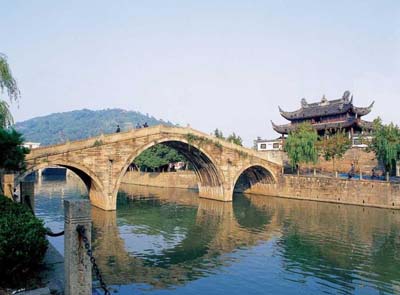 游人至余姚,多要去看看橫跨姚江的通濟橋。這座拱型三孔石橋長43.4米,主孔凈跨14.2米,橋面中心寬5.61米,兩側有望柱24根,欄板22塊,雕飾象、獅、蓮花等圖像。主孔兩側各鐫有楹聯。東側是“千里遙吞滄海月;萬年獨砥大江流!;西側是“一曲蕙蘭飛彩?;雙城煙雨臥長虹!闭麄橋型顯得穩重、雄偉。遠遠望去,長虹中跨,體勢騰輝。因它原是姚江上最長最高的橋,故有“浙東第一橋”之稱。