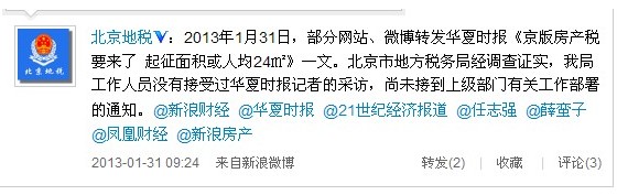 北京市地方稅務局發表官方微博稱,“2013年1月31日,部分網站、微博轉發華夏時報《京版房產稅要來了起征面積或人均24㎡》一文。北京市地方稅務局經調查證實,我局工作人員沒有接受過華夏時報記者的采訪,尚未接到上級部門有關工作部署的通知!