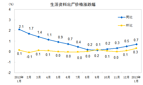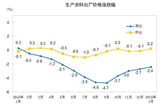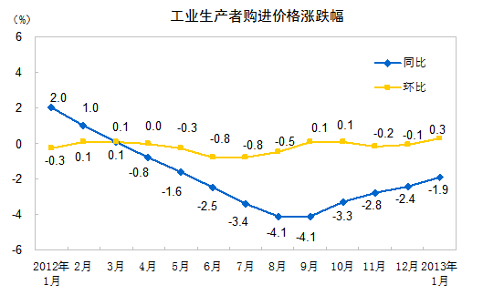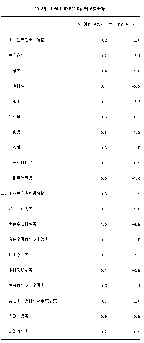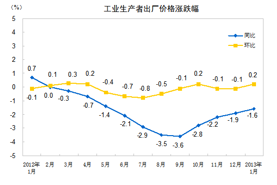 2013年1月份,全國工業生產者出廠價格同比下降1.6%,環比上漲0.2%。工業生產者購進價格同比下降1.9%,環比上漲0.3%。