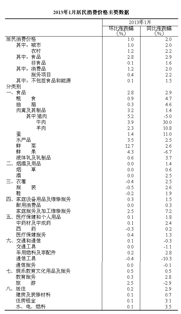 2013年1月份,全國居民消費價格總水平同比上漲2.0%。其中,城市上漲2.0%,農村上漲2.2%;食品價格上漲2.9%,非食品價格上漲1.6%;消費品價格上漲2.0%,服務價格上漲2.2%。