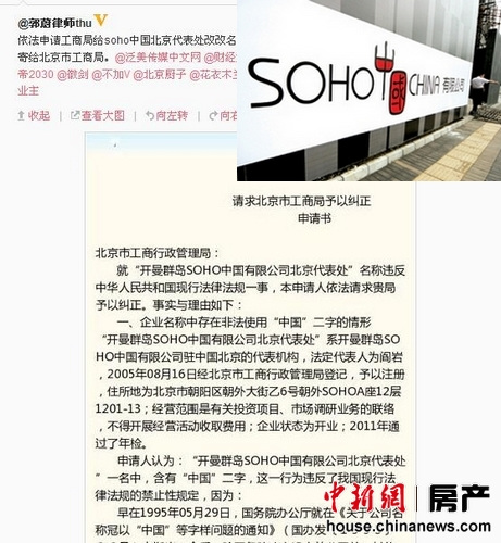 SOHO中國涉嫌串通“房姐”洗錢風波未停,其企業名稱“開曼群島SOHO中國有限公司北京代表處”又被指涉嫌違法違規。昨天,有律師身份的網友在微博公開了一份申請書,要求北京市工商行政管理局將SOHO中國企業名稱中的“中國”二字去掉。