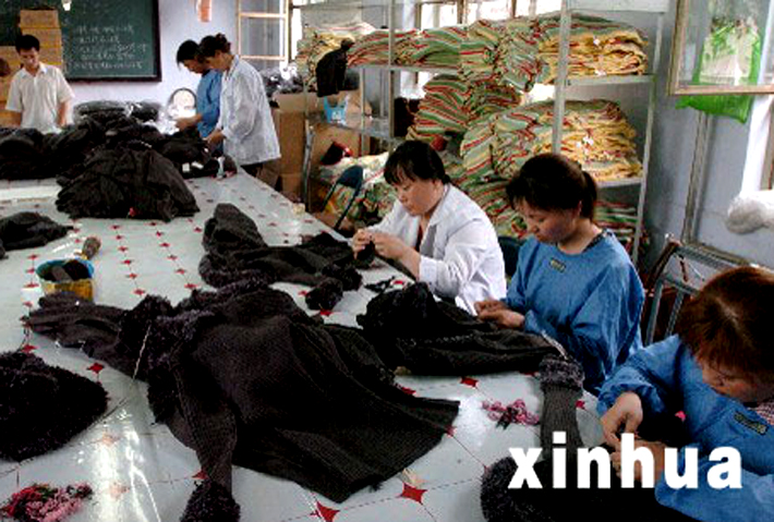 2005年7月14日,遼寧省阜新市萬華工藝編織有限公司的職工在織毛衣。新華社記者攝 |
