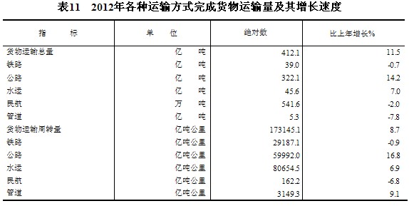 全年貨物運輸總量412億噸,比上年增長11.5%。貨物運輸周轉量173145億噸公里,增長8.7%。全年規模以上港口完成貨物吞吐量97.4億噸,比上年增長6.8%,其中外貿貨物吞吐量30.1億噸,增長8.8%。規模以上港口集裝箱吞吐量17651萬標準箱,增長8.1%。