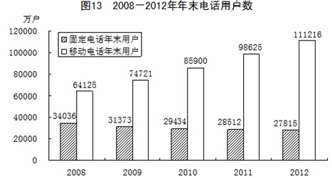 全年完成郵電業務總量[14]15022億元,比上年增長13.0%。其中,郵政業務總量2037億元,增長26.7%;電信業務總量12985億元,增長11.1%。郵政業全年完成郵政函件業務70.74億件,包裹業務0.69億件,快遞業務量56.85億件。電信業全年局用交換機容量新增478萬門,總容量43906萬門;新增移動電話交換機容量[15]11234萬戶,達到182870萬戶。年末固定電話用戶27815萬戶,其中,城市電話用戶18893萬戶,農村電話用戶8922萬戶。新增移動電話用戶12590萬戶,年末達到111216萬戶,其中3G移動電話用戶[16]23280萬戶。年末全國固定及移動電話用戶總數達到139031萬戶,比上年末增加11896萬戶。電話普及率達到103.2部/百人;ヂ摼W上網人數5.64億人,其中寬帶上網人數5.30億人;ヂ摼W普及率達到42.1%。
