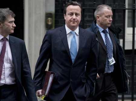 圖為英國首相卡梅倫27日正離開唐寧街10號首相官邸,準備參加國會下議院的質詢會議。 針對英國主權債務日前被信用評級機構穆迪下調,當天卡梅倫對議會表示,“評級下調提醒我們應該更快更大規模的實施減赤措施!27日發布的英國2012年國內生產總值增長率為0.2%,高于市場預期的零增長。