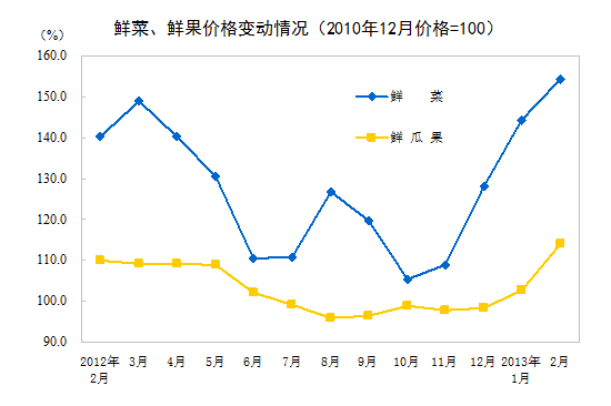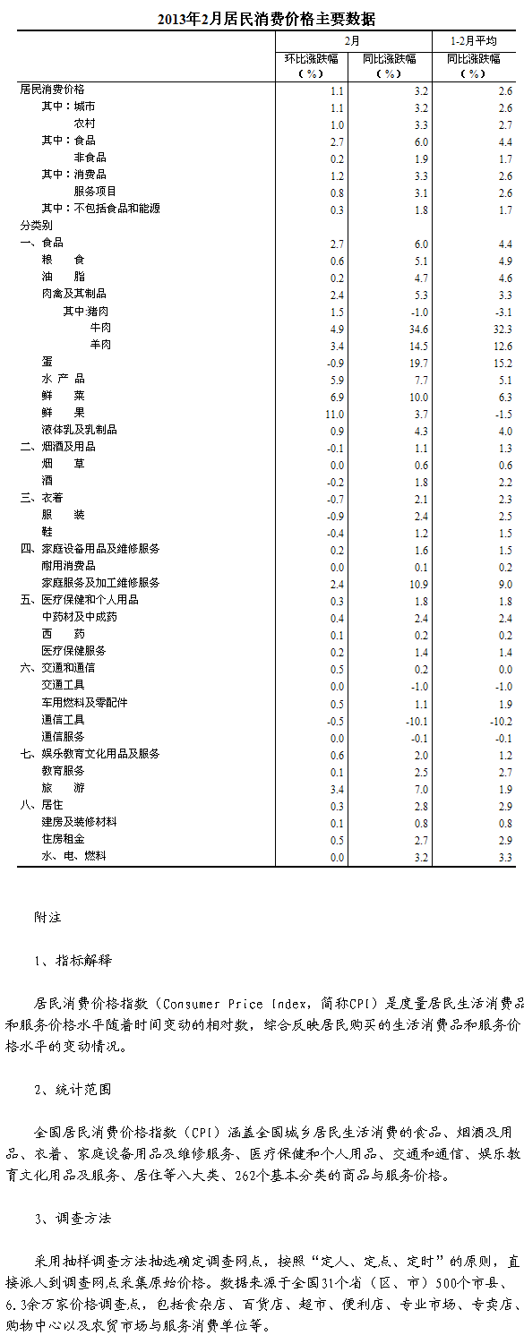 2013年2月份,全國居民消費價格總水平同比上漲3.2%。其中,城市上漲3.2%,農村上漲3.3%;食品價格上漲6.0%,非食品價格上漲1.9%;消費品價格上漲3.3%,服務價格上漲3.1%。