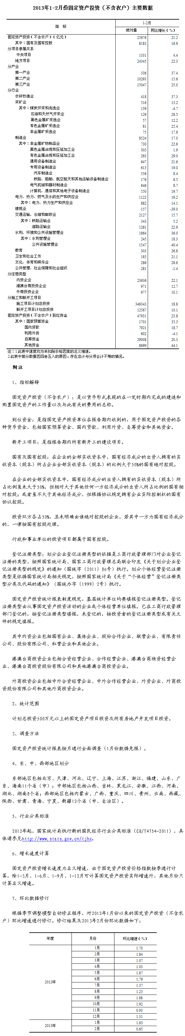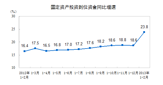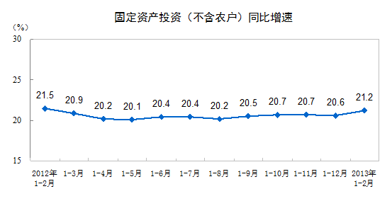 2013年1-2月份,全國固定資產投資(不含農戶)25676億元,同比名義增長21.2%,增速比去年全年加快0.6個百分點,比去年同期回落0.3個百分點。從環比看,2月份固定資產投資(不含農戶)增長0.65%。