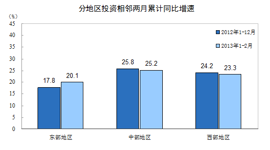 分地區看,1-2月份,東部地區投資13960億元,同比增長20.1%,增速比去年全年加快2.3個百分點;中部地區投資5785億元,增長25.2%,增速回落0.6個百分點;西部地區投資5668億元,增長23.3%,增速回落0.9個百分點。
