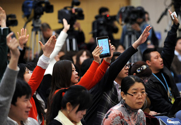 3月13日,十二屆全國人大一次會議新聞中心在梅地亞中心多功能廳舉行記者會。民政部部長李立國,副部長姜力、竇玉沛就“保障基本民生,發展社會服務”的相關問題回答中外記者的提問。圖為記者舉著ipad提問。