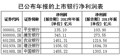 3月26日,農業銀行和中國銀行業績報告出爐,年報顯示,農行、中行2012年分別實現凈利潤1450.94億元、1394.32億元,同比增長幅度分別為19%、12.20%。此前,建設銀行24日晚間發布2012年年報,公司去年實現凈利潤1931.79億元,同比增長14.13%。