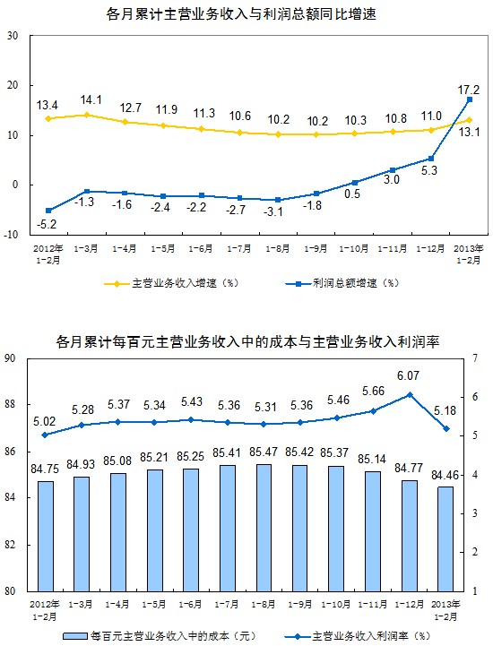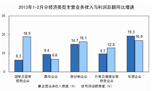 1-2月份在規模以上工業企業中,國有及國有控股企業實現利潤2125億元,比去年同期增長18.9%;集體企業實現利潤106億元,增長6.8%;股份制企業實現利潤4102億元,增長16.1%;外商及港澳臺商投資企業實現利潤1592億元,增長12.8%;私營企業實現利潤2306億元,增長16.9%。