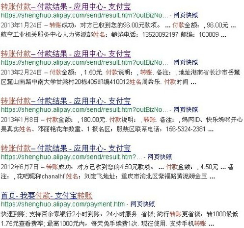 事實上,直接搜索“site:shenghuo.alipay.com”就能搜到轉賬信息,數量超過2000條。記者隨即致電支付寶24小時客服熱線95188反映情況,按照記者提供的方法搜索,的確發現這一嚴重安全漏洞,客服人員表示,此前并不知道谷歌中能夠搜索到轉賬信息,稱將記錄并向公司反映情況。
