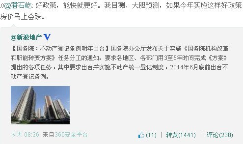 3月28日,國務院辦公廳就實施《國務院機構改革和職能轉變方案》任務分工進行通知,要求2014年6月底前出臺并實施不動產統一登記制度,由國土資源部、住房城鄉建設部會同法制辦、稅務總局等有關部門負責。對此,SOHO中國董事長潘石屹微博評論稱這是個好政策,并大膽預測,如果今年實施房價馬上會跌。