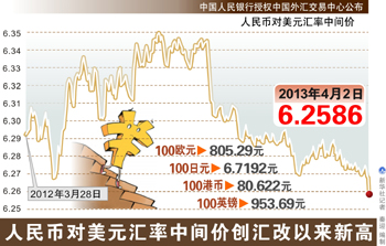 人民幣升值預期再次升溫。4月2日,人民幣對美元中間價升至6.2586,創下新高;詢價交易市場人民幣對美元即期匯率升至6.1986也再次刷新高點。