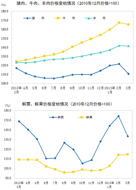 2013年3月份,全國居民消費價格總水平同比上漲2.1%。其中,城市上漲2.0%,農村上漲2.2%;食品價格上漲2.7%,非食品價格上漲1.8%;消費品價格上漲1.7%,服務價格上漲3.1%。