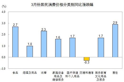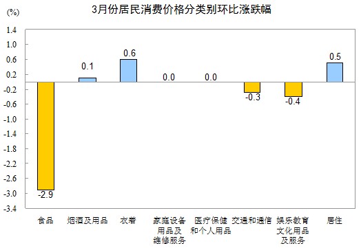 3月份,全國居民消費價格總水平環比下降0.9%。其中,城市下降0.9%,農村下降1.0%;食品價格下降2.9%,非食品價格上漲0.1%;消費品價格下降1.3%,服務價格持平(漲跌幅度為0)。