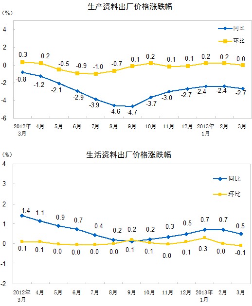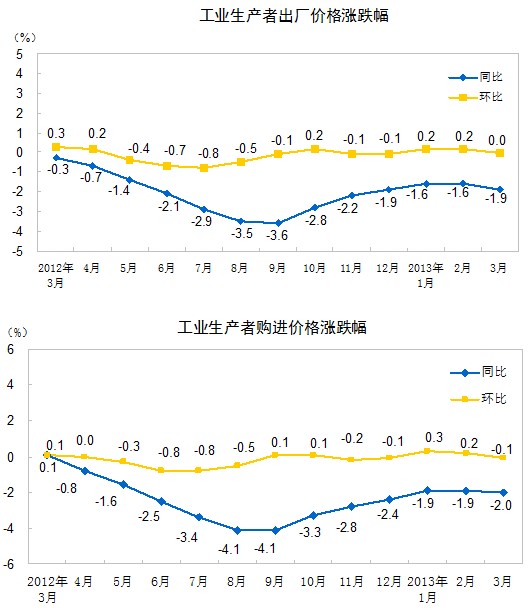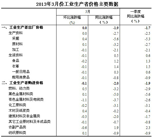 2013年3月份,全國工業生產者出廠價格同比下降1.9%,環比持平(漲跌幅度為0)。工業生產者購進價格同比下降2.0%,環比下降0.1%。一季度,工業生產者出廠價格同比下降1.7%,工業生產者購進價格同比下降1.9%。