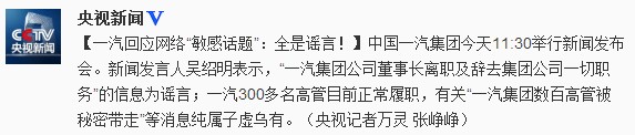 據央視記者報道,中國一汽集團今天11:30舉行新聞發布會。新聞發言人吳紹明表示,“一汽集團公司董事長離職及辭去集團公司一切職務”的信息為謠言;一汽300多名高管目前正常履職,有關“一汽集團數百高管被秘密帶走”等消息純屬子虛烏有。
