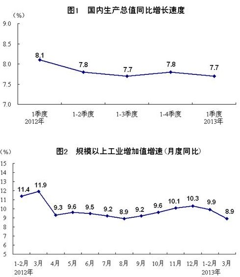 2012年各季度及2013年1季度GDP環比增速分別為1.6%、1.9%、2.1%、2.0%和1.6%。