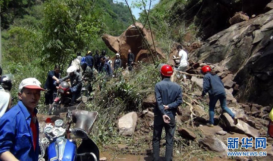4月20日,四川省雅安市蘆山縣地震重災區龍門鄉道路被塌方山石阻塞。