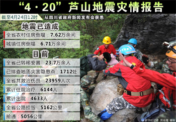 ——截至24日14時,蘆山地震共計造成196人死亡,21人失蹤,11470人受傷。