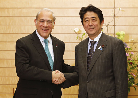 經濟合作與發展組織秘書長安赫爾·古里亞(左)24日在東京與日本首相安倍晉三舉行會談。經合組織在其發布的日本經濟年度報告中,肯定了安倍政府近期推行的激進經濟刺激政策,認為日本結束長達15年之久的通縮局面是當務之急。報告同時警告,日本應控制公共債務繼續膨脹。