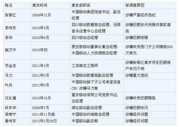 自從2009年12月中國移動原黨組書記張春江涉及第一次腐敗案開始,到如今上述天津移動高層涉案,中國移動“落馬”的管理層已經多達12人。與數據業務相關的有四川移動數據部原總經理李向東、集團原副總經理馬力以及數據部原部長、卓望控股CEO葉兵。