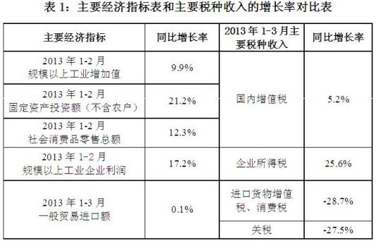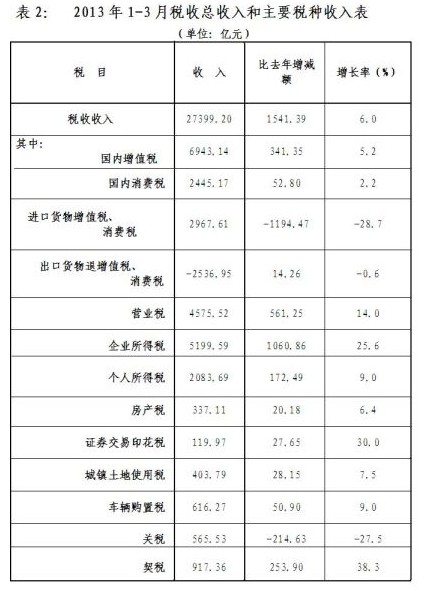 稅收收入增長的總體特點:一是稅收總收入增速回落。2013年1-3月全國稅收總收入完成27399.20億元,同比增長6.0%,比去年同期增速回落了4.3個百分點。二是進口稅收大幅下降。1-3月進口貨物增值稅消費稅、關稅同比分別下降28.7%和27.5%,比去年同期增速分別回落41.7和37.1個百分點。三是成品油、煤炭等能源行業相關稅收收入明顯下降。成品油增值稅、企業所得稅同比分別下降16.9%和40.1%。煤炭增值稅、企業所得稅同比分別下降26.3%和18.4%。四是房地產交易相關稅收收入反彈。1-3月,契稅、房地產營業稅和土地增值稅同比分別增長38.3%、48.2%和34.7%,比去年同期增速分別加快51.9、65.7和30.2個百分點。