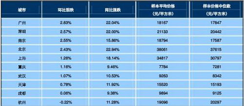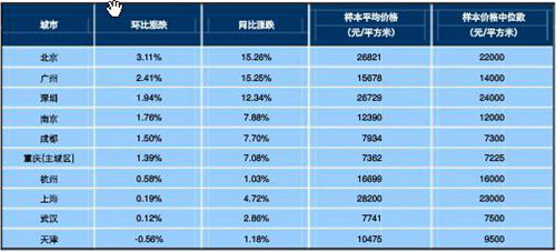其中,北京、上海等十大城市住宅均價為17023元/平方米,環比上月上漲1.31%,與上年同期相比上漲7.89%。另外,按100個城市住宅價格的中位數計算,全國住宅價格中位數為6967元/平方米,環比上月上漲1.09%。
