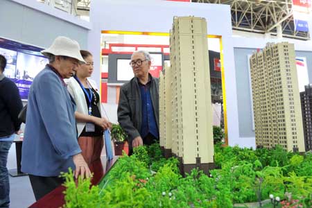 5月1日,在第五屆中國西部(銀川)房·車博覽會上,觀展者正在一處樓盤的沙盤前參觀咨詢。 當日,第五屆中國西部(銀川)房·車博覽會也迎來了看房購房的高峰,本次博覽會共展出了區內外30家房地產企業的50多個項目,其中不少房企打出了低價、環保、防震等促銷牌,吸引了大批觀展者前往參觀咨詢,目前,博覽會開展的前三天已經達成房屋銷售287套左右。