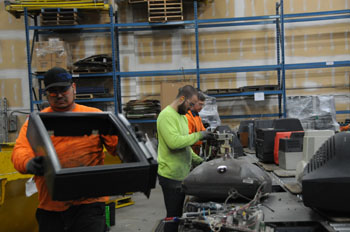加拿大消費者在購買電子產品時會支付一定的“環境處理費”,這筆資金會幫助相關機構對電子垃圾的回收處理。圖為加拿大大溫哥華地區的一家電子垃圾回收廠內的工作人員正在對拆解后的電子垃圾零件進行分類。記者