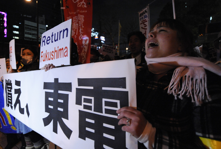 3月11日,在日本東京的東京電力公司總部前,游行者手持標語、呼喊口號進行抗議核電站的游行。游行者呼吁東電向福島市民賠償,并反對重啟核電站。關賢一郎/攝 |