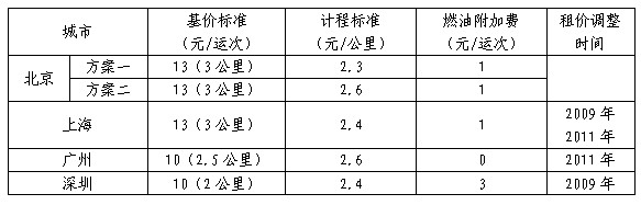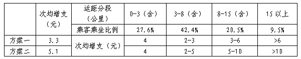 方案一:基價標準由10元/3公里調整為13元/3公里;計程標準由2元/公里調整為2.3元/公里。燃油附加費由3公里以上運次加收3元調整為全部運次加收1元。
