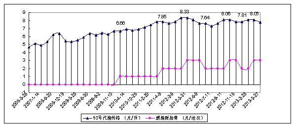2011年2月20日,本市93號汽油價格達到7.45元/升,超過租價油價聯動機制啟動點7.10元/升?紤]價格宏觀調控情況,未進行租價調整,繼續采取加收燃油附加費方式。2011年2月以來,本市根據油價變動,4次上調2次下調燃油附加費標準。