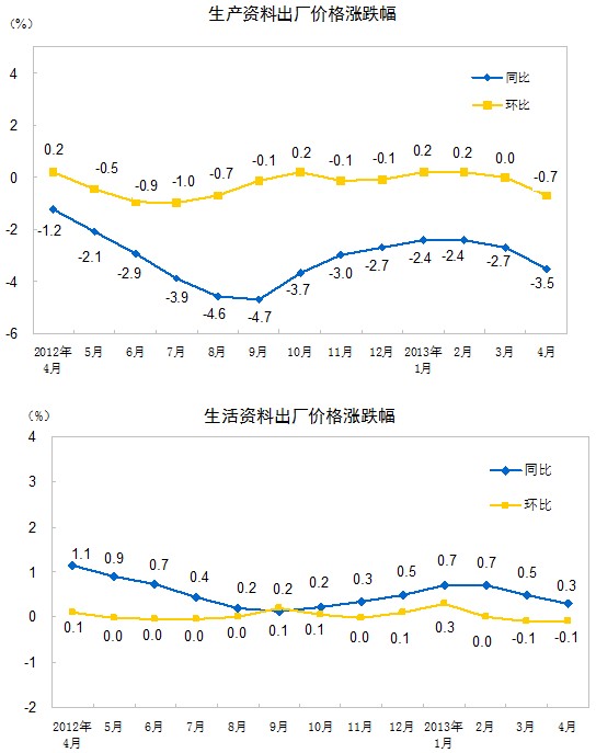 2013年4月份,全國工業生產者出廠價格同比下降2.6%,環比下降0.6%。工業生產者購進價格同比下降2.7%,環比下降0.6%。1-4月平均,工業生產者出廠價格同比下降2.0%,工業生產者購進價格同比下降2.1%。