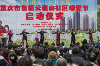 重慶市日前正式啟動為6個公租房小區26萬余人打造的“首屆公租房社區鄰里節”,通過文化表演、醫療保健、志愿者服務等活動,使公租房的居民互相熟悉、學習和幫助,讓整個小區變為一個和睦的大家庭。圖為公租房城南家園廣場上,居民欣賞豐富多彩的文藝表演活動。記者