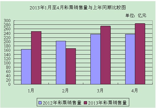 1月至4月累計,全國共銷售彩票976.22億元,同比增加137.96億元,增長16.5%。其中,福利彩票機構銷售558.86億元,同比增加72.4億元,增長14.9%;體育彩票機構銷售417.36億元,同比增加65.56億元,增長18.6%。