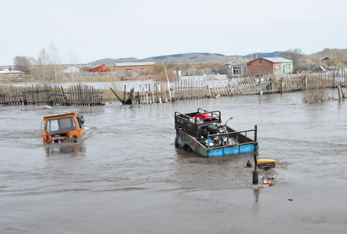 5月9日,伊敏河鎮的兩輛拖拉機被淹沒在洪水中。記者 鄒儉樸/攝 |