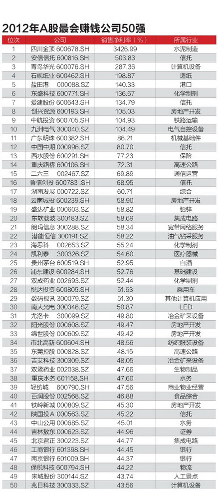 按照銷售凈利率排名,有趣的一幕出現了,位列最賺錢公司榜首的工商銀行的銷售凈利率只排在第46位。第一名被四川金頂獲得,而2011年榜單榜首的吉林敖東則降到了第44名。