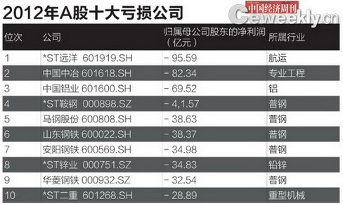 2012年A股十大虧損公司依次是:*ST遠洋、中國中冶、中國鋁業、*ST鞍鋼、馬鋼股份、山東鋼鐵、安陽鋼鐵、*ST鋅業、華菱鋼鐵、*ST二重。