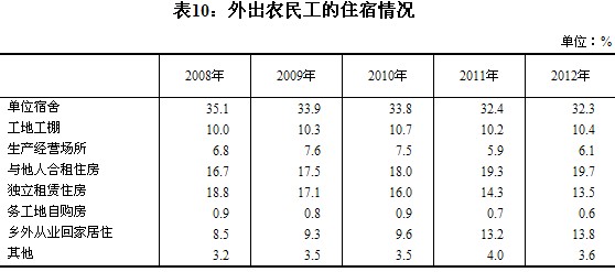 以受雇形式從業的農民工,在單位宿舍中居住的占32.3%,在工地或工棚居住的占10.4%,在生產經營場所居住的占6.1%,與他人合租住房的占19.7%,獨立租賃住房的占13.5%,有13.8%的外出農民工在鄉鎮以外從業但每天回家居住,僅有0.6%的外出農民工在務工地自購房。從近幾年外出農民工居住情況的變化看,呈現出與他人合租住房比重上升、獨立租賃住房比重下降的趨勢,另一明顯變化態勢是務工地自購房比重下降、鄉外從業回家居住比重上升。