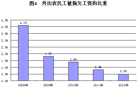 外出受雇農民工,被雇主或單位拖欠工資的占0.5%,比上年下降了0.3個百分點。建筑業農民工被拖欠工資的占1.5%,比上年下降0.4個百分點。從近幾年調查數據看,被雇主或單位拖欠工資的農民工比例逐年下降,解決和遏制農民工工資拖欠的一系列政策措施,取得明顯成效。